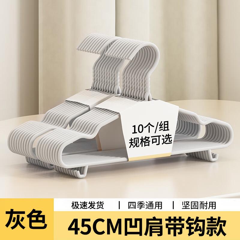 法洁诺衣架加粗加大挂衣服家用挂衣成年人晒衣服撑子宿舍用学生无痕防滑 【新升级凹带钩】45cm浅灰色 10支 【特粗款】